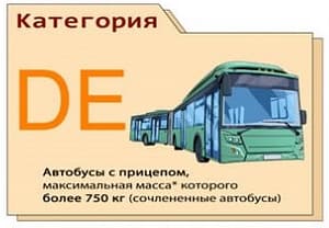 | «DЕ» | — | Автомобилями категории «D», сцепленными с прицепом, разрешенная максимальная масса которого превышает 750 килограммов; сочлененными автобусами | Не моложе 22 лет | 22 лет + имеющие право управления транспортными средствами категории «D» не менее 12 месяцев (за исключением транспортных средств Вооруженных Сил РФ) |