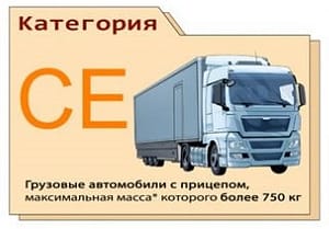 | «СЕ» | — | Автомобилями категории «С», сцепленными с прицепом, разрешенная максимальная масса которого превышает 750 килограммов | Не моложе 19 лет | 19 лет + имеющие право управления транспортными средствами категории «С» не менее 12 месяцев |