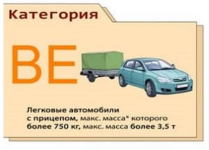 | «ВЕ» | — | Автомобилями категории «В», сцепленными с прицепом, разрешенная максимальная масса которого превышает 750 килограммов и превышает массу автомобиля без нагрузки; автомобилями категории «В», сцепленными с прицепом, разрешенная максимальная масса которого превышает 750 килограммов, при условии, что общая разрешенная максимальная масса такого состава транспортных средств превышает 3500 килограммов | Не моложе 19 лет | 19 лет + имеющие право управления транспортными средствами категории «В» не менее 12 месяцев |