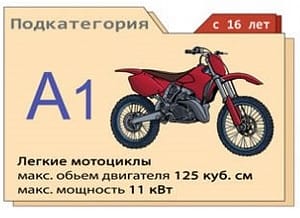Данная подкатегория прав распространяется на мотоциклы с двигателями малых объемов (125 куб. см) и малой мощностью (не больше 11 кв). А1 присваивается водителям одновременно с основной — А, получать ее отдельно не нужно. Примечательно, что обладать ею можно уже с 16 лет.